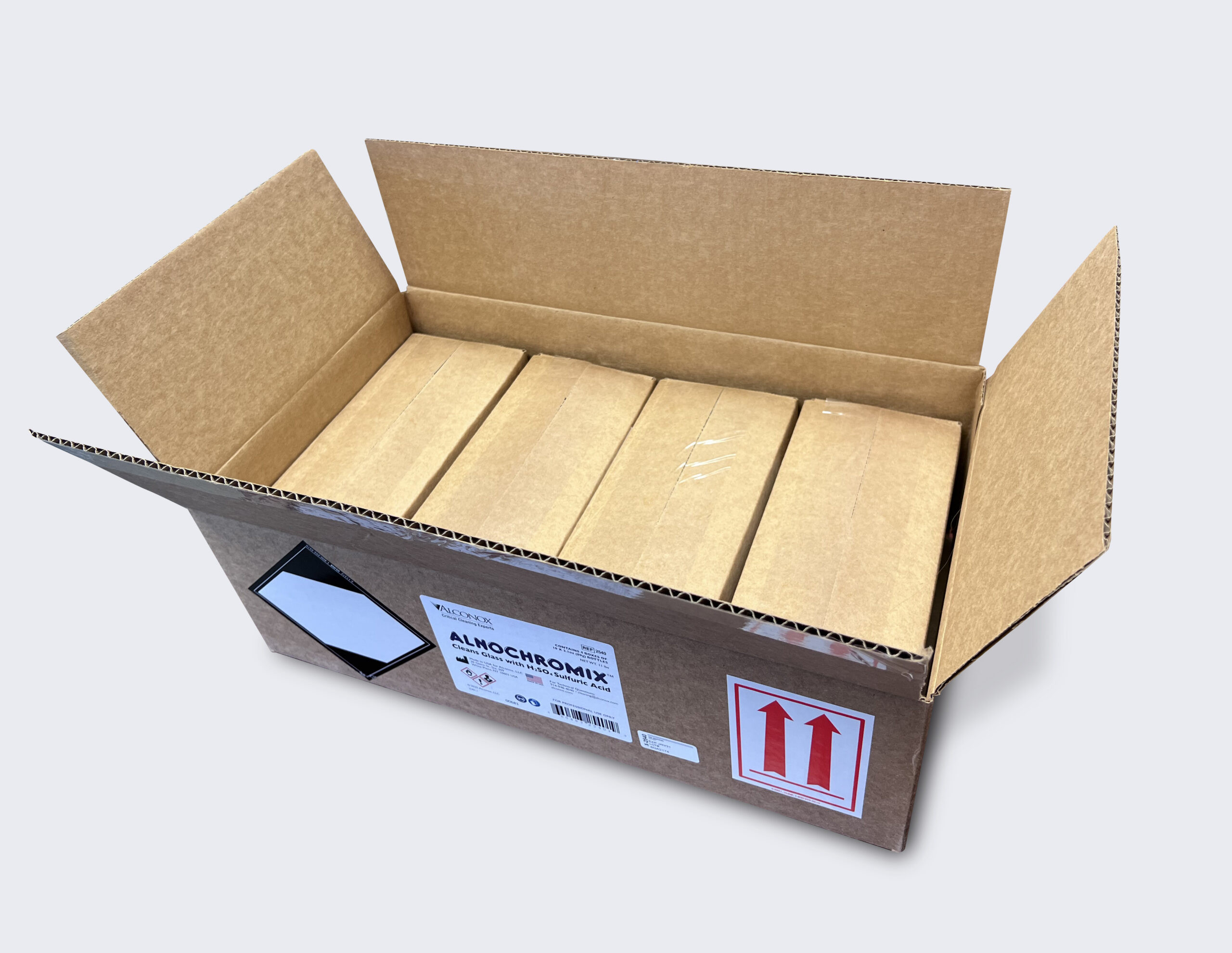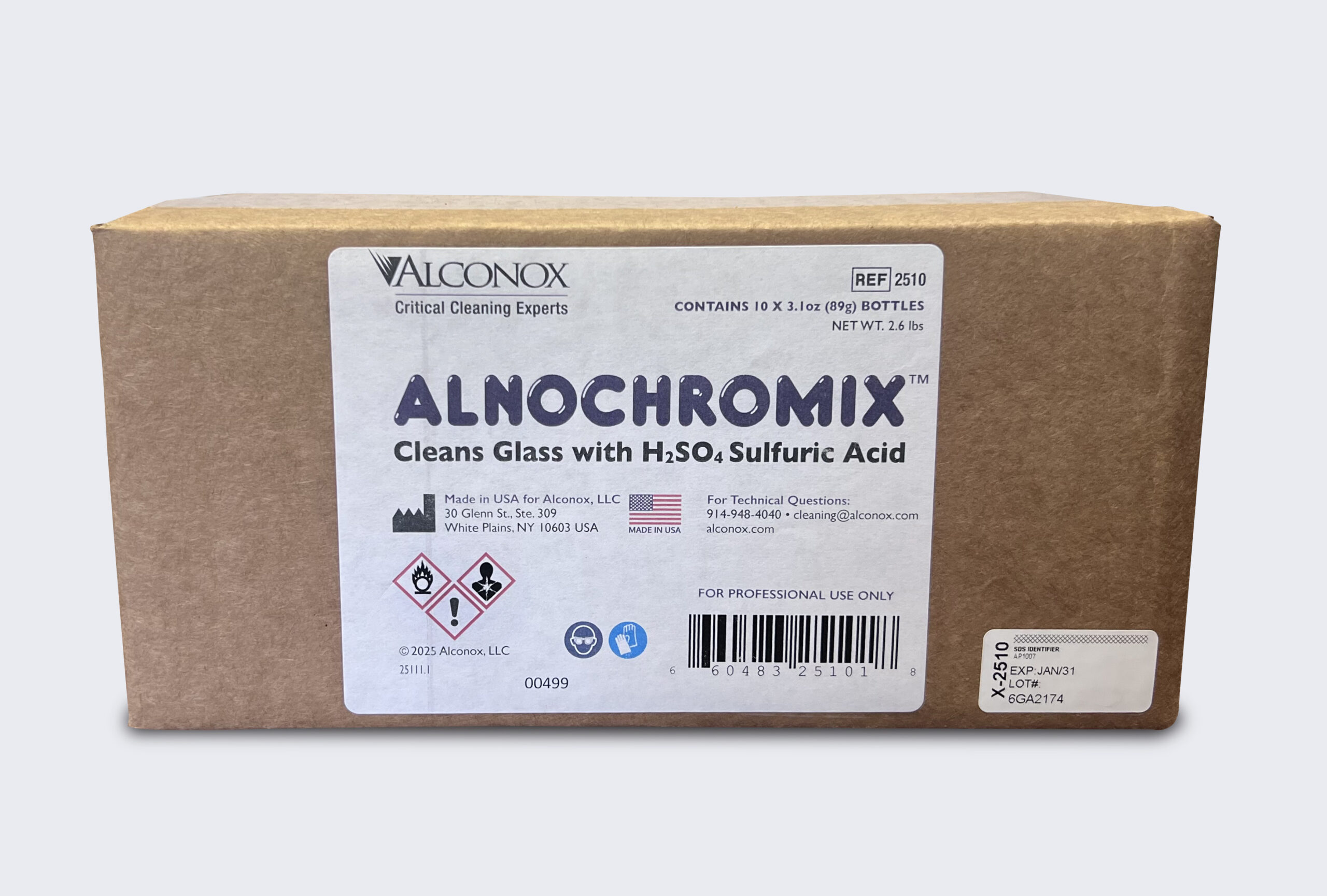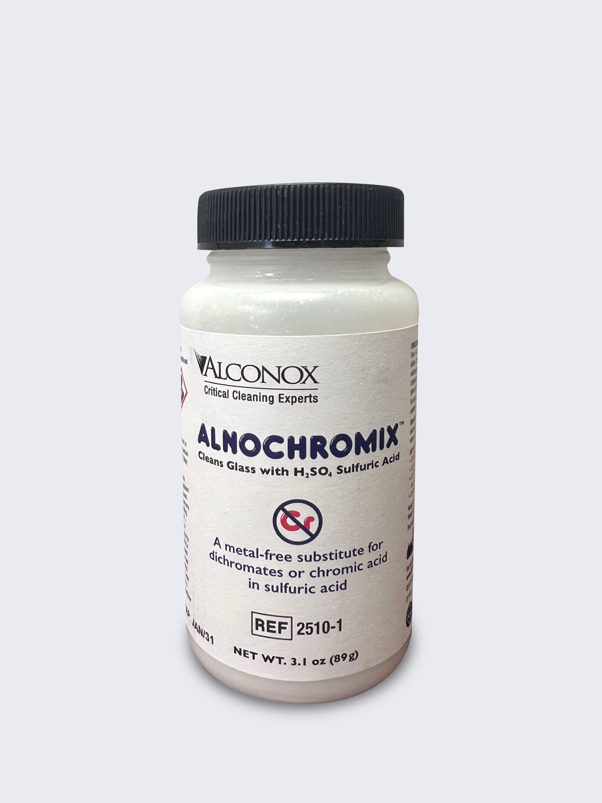 Pour 1-2 pouches of ALNOCHROMIX™ crystals into 98% concentrated sulfuric acid container (2.5L or 1gal capacity). Note, ALNOCHROMIX is identical to NOCHROMIX® from Godax Laboratories.